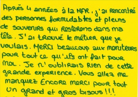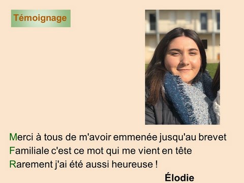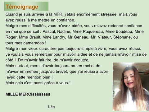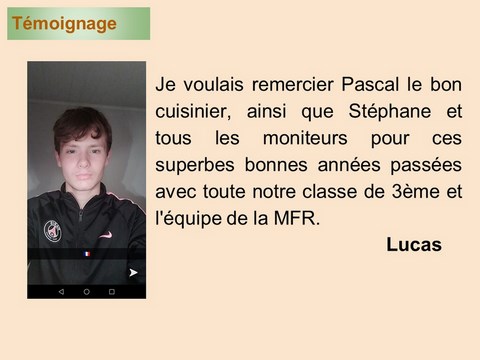 Je tenais à remercier l'ensemble de l'équipe pédagogique de la Maison Familiale Rurale pour les 2 années que Nicolas a effectué au sein de votre établissement.