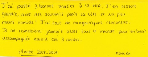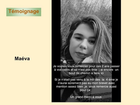 A la MFR, j'ai de meilleures notes, je me sens beaucoup mieux ici et puis j'apprends mieux. Je me disais que le collège ce n'était pas pour moi, je ne regrette pas mon choix d'être venue à la MFR.