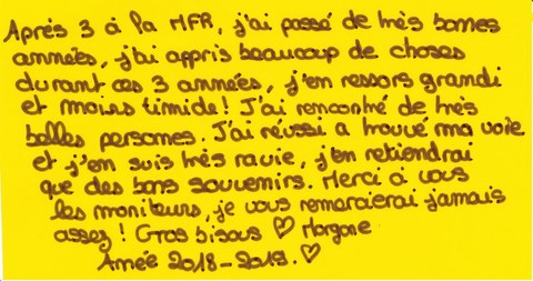 Je tenais à remercier l'ensemble de l'équipe pédagogique de la Maison Familiale Rurale pour les 2 années que Nicolas a effectué au sein de votre établissement.